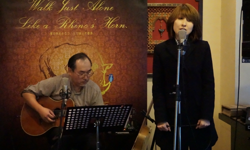 中也記念館での「アルチュール・ランボー詩と手紙」がきっかけで、ギタリストの梅尾さんにお声かけ頂いたのです。生ギターでの「アルチュール・ランボー」でした。中原中也訳のものを4篇選びました。楽しかったんですよ。また山口に呼んでもらえてうれしかったし、カレーまでごちそうして頂き、おおはしゃぎだったんです。花野組一同、大感謝しております!