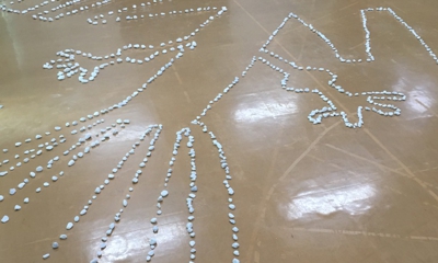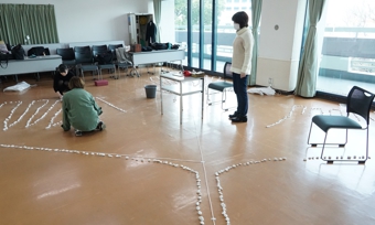 ナスカの地上絵コンドルを白い小石で描き、その上で演技する予定でした。まさかのインフル感染の私はもちろん稽古場に行けず…花野PD、舞台監督Y子、手伝いの綾乃氏と3人での力作。途中で石が足りなくなりPDはナフコに買いに行ったそうです。遺跡みたいということで文化祭脱出か。327日目