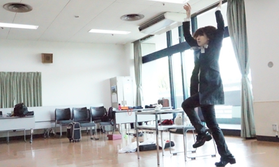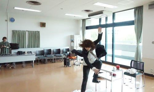 通し稽古中。前半のクライマックスで妄想の恋人を殴っているところ。頬を平手打ちする音は生音で舞監Y子が本番も手を叩いて表現しています。今日はバッチリだったとか不発だったとか、稽古後に必ず話題になります。私も思いっきりですが、こんな風に殴ったら本当は逮捕されると思います!339日目。